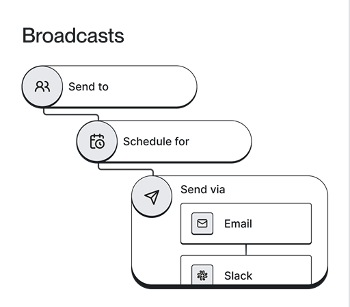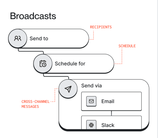 Send messages across email, SMS, push, chat, and in-app.