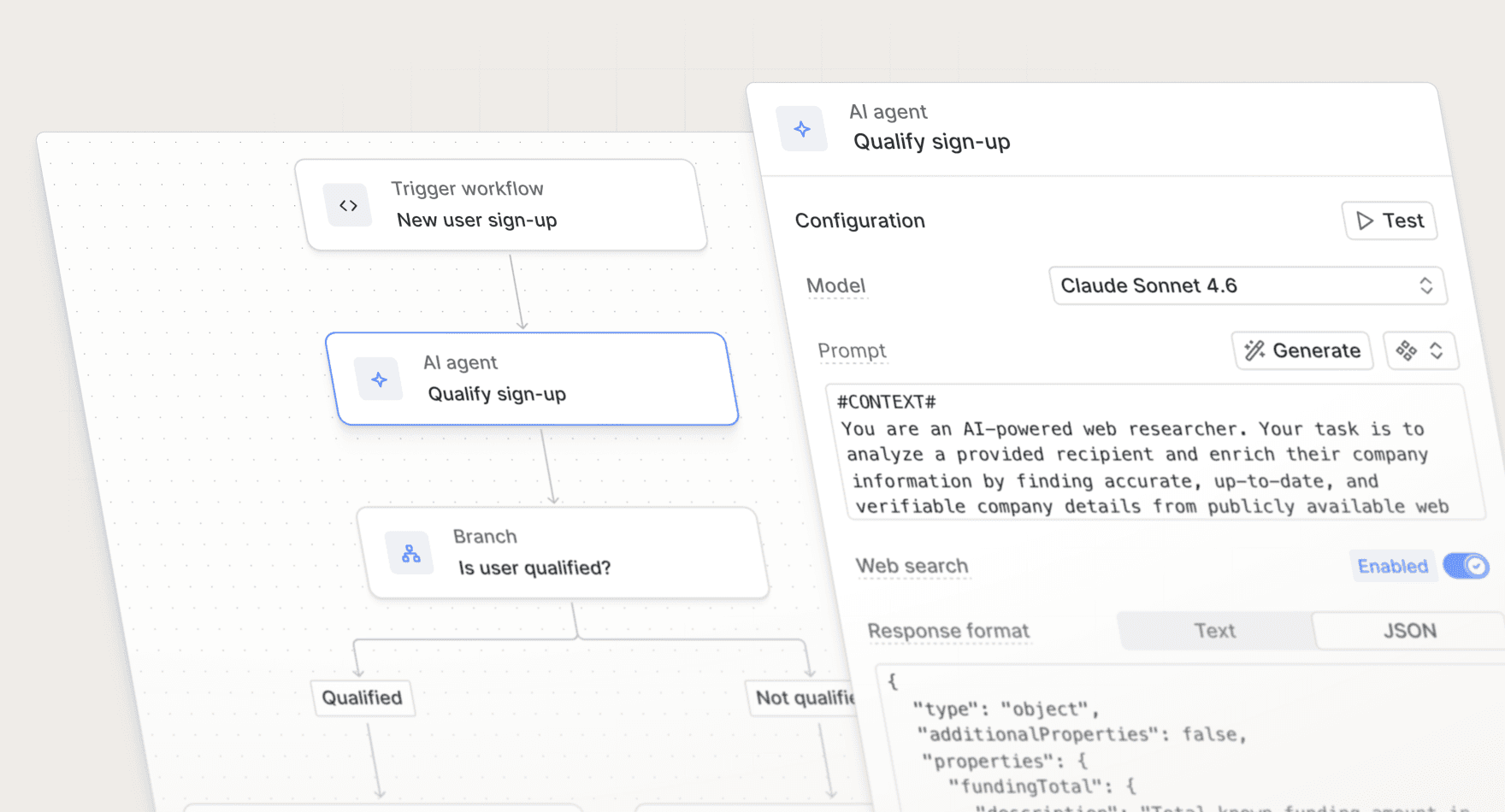 Run prompts on AI models directly in your workflows to gather context, enrich data, and personalize messaging.