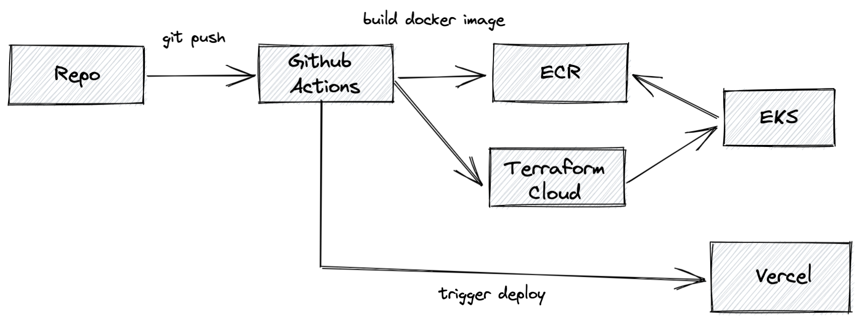mainwe build one or more new containers, push them to ECR, trigger a new deployment in Terraform Cloud, and signal Vercel to deploy for front-end assets. This all happens in our development environment. - Production releases are semantic version tags (