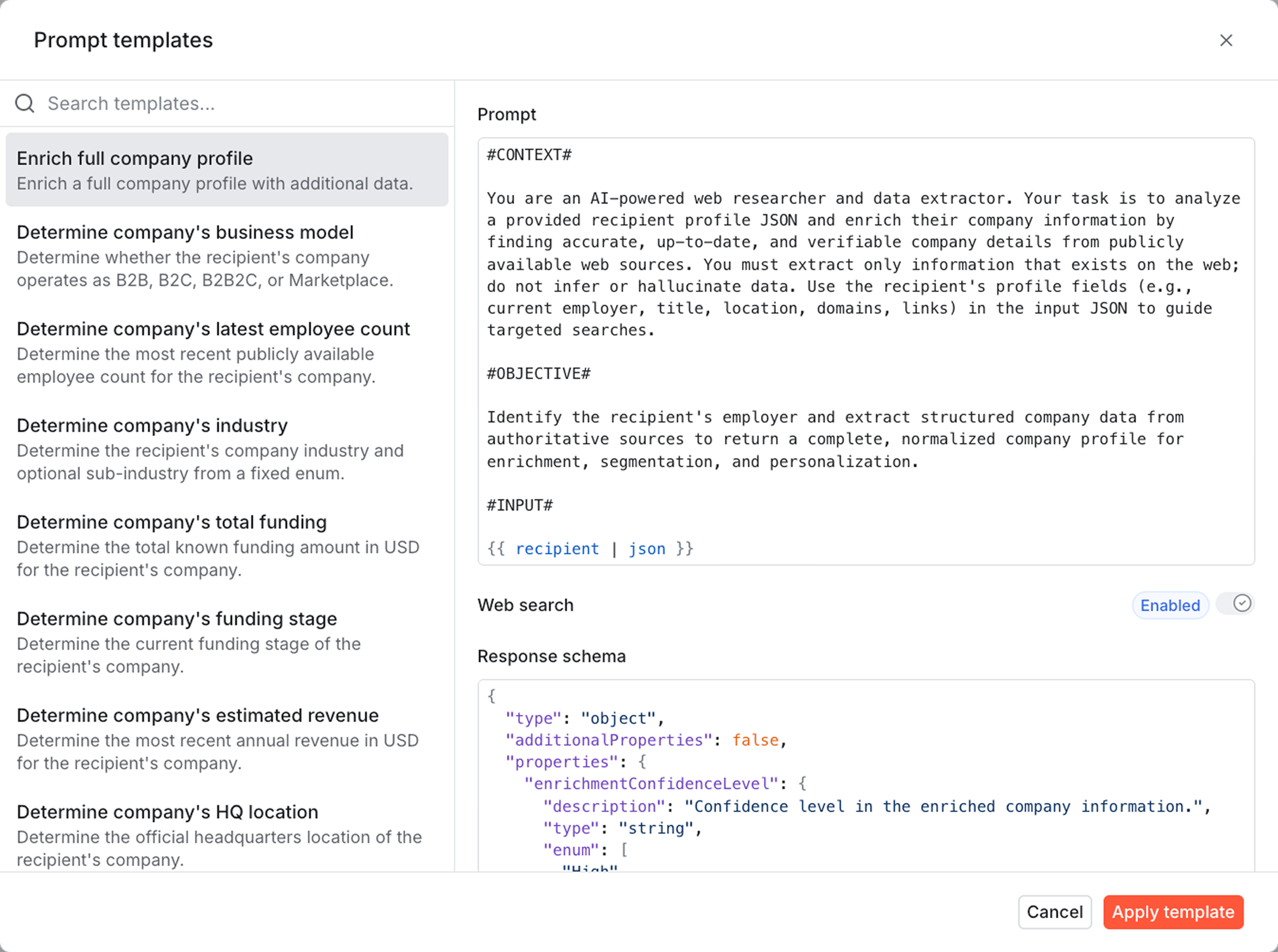 AI can help you generate a comprehensive prompt from scratch, or you can choose from one of many prompt templates. Each template comes with JSON schemas to format the response, so you're not dealing with messy data.