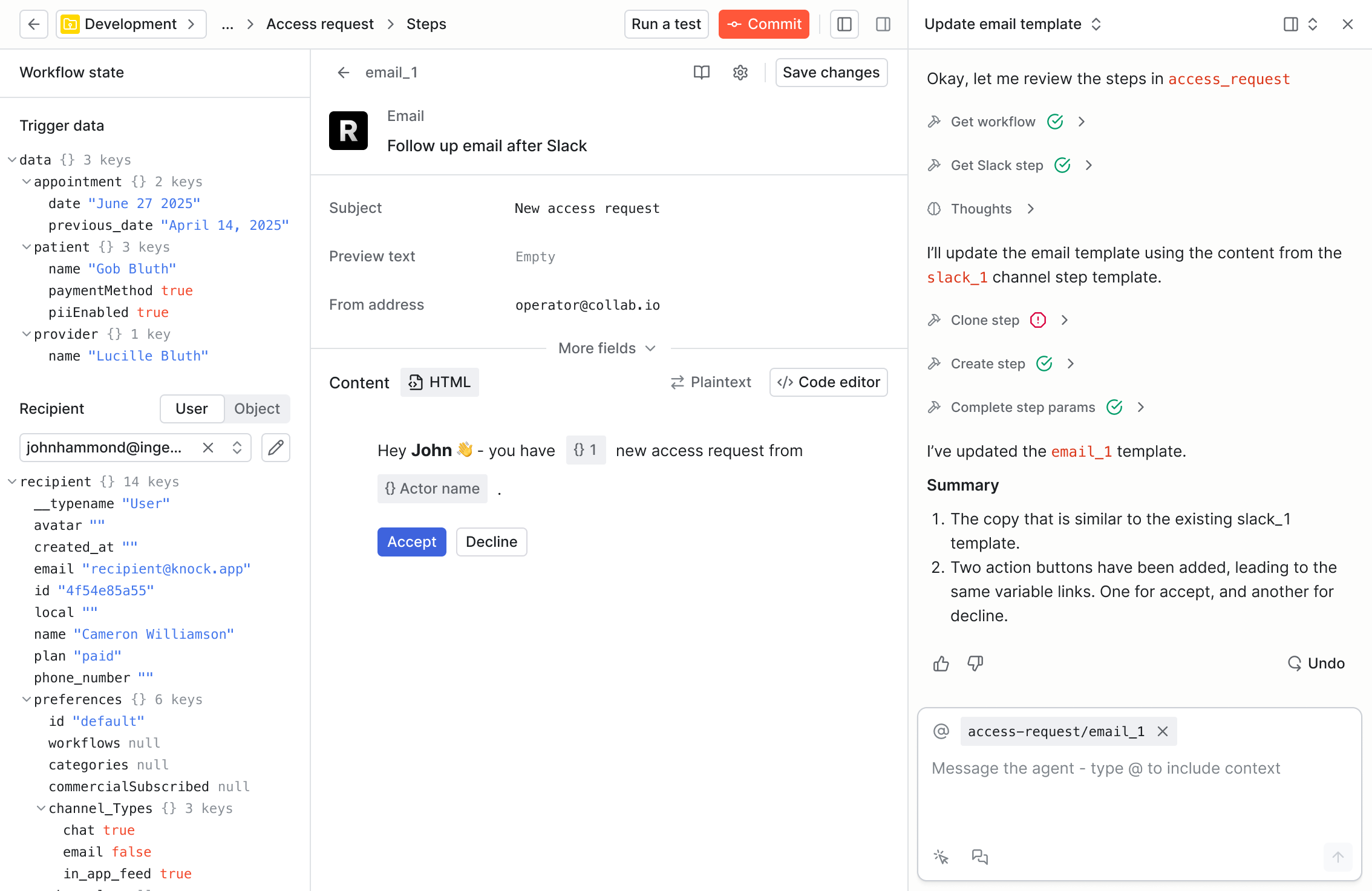 With agent mode, you’ll be able to build and update workflows, templates, and grep across all of Knock and make bulk updates from within the Knock dashboard.