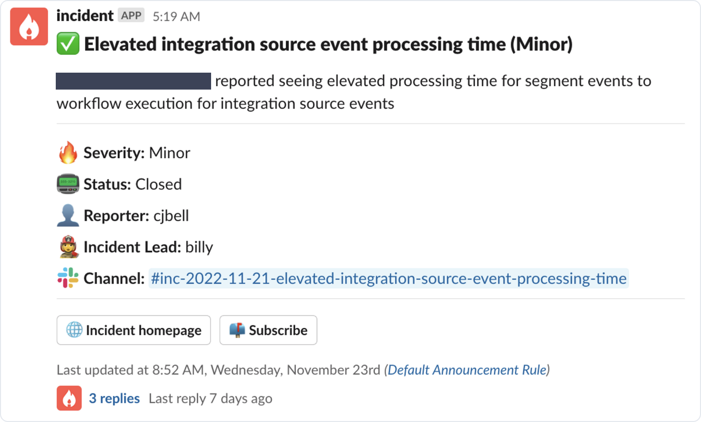 Here’s a great example of these concepts in action from one of our favorite Slack apps at Knock: incident.io.