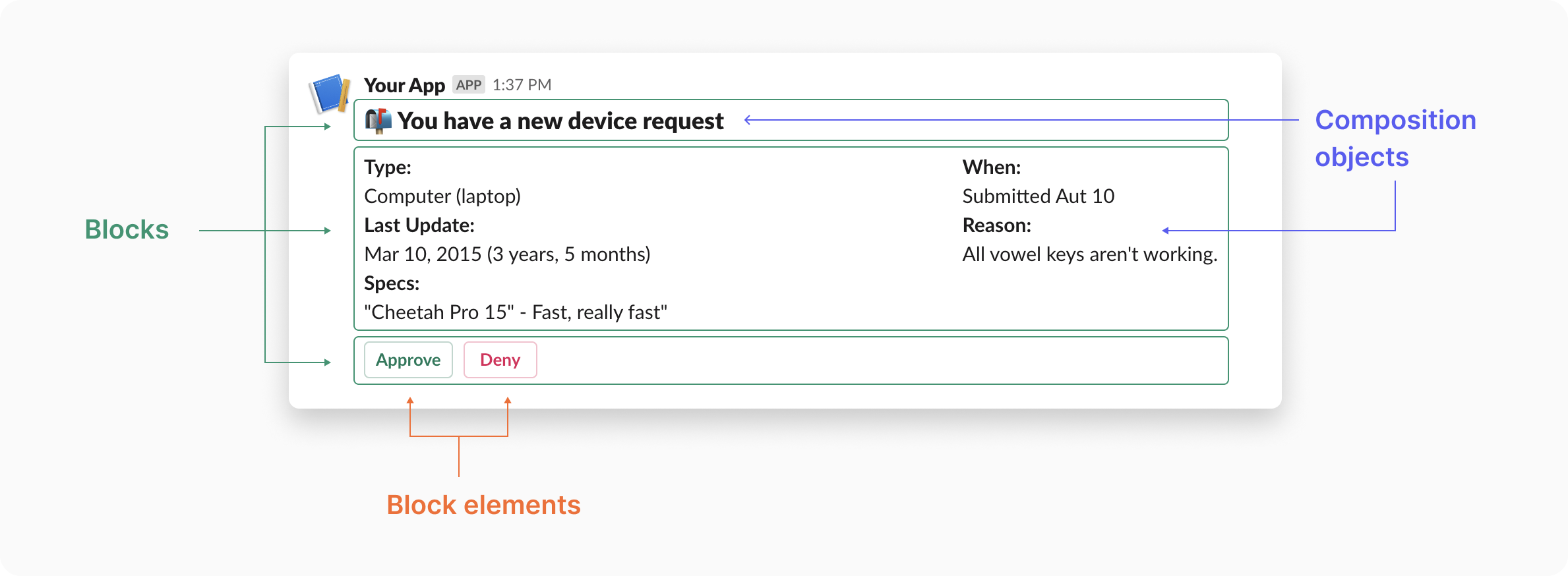 The Slack block kit UI framework is comprised of three building blocks (no pun intended) you’ll use to compose your Slack message templates: blocks, block elements, and composition objects. We go into detail on each below.